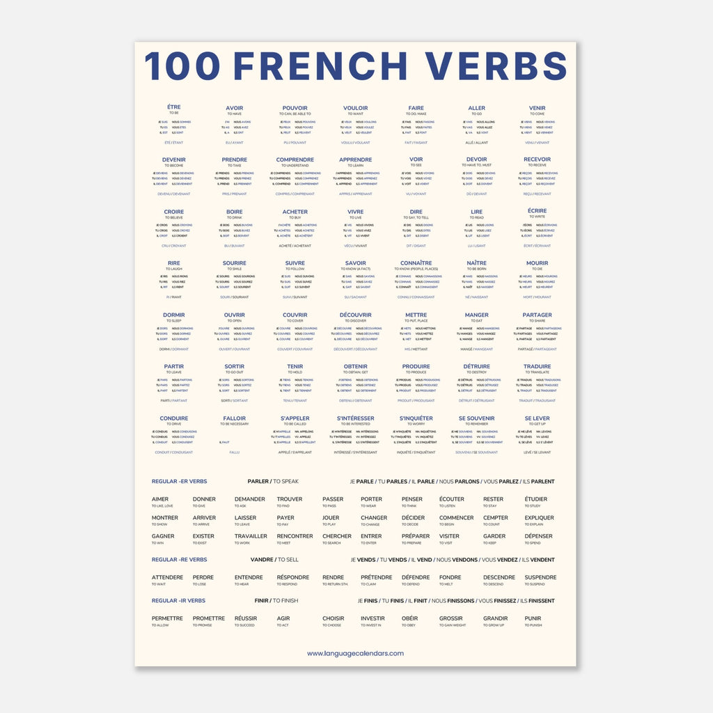 This minimalist A2 poster features 100 of the most commonly used French verbs, each with its present-tense conjugations clearly displayed. It includes both regular verb patterns and the most essential irregular verbs, helping you master how French really works — from parler to avoir to aller.