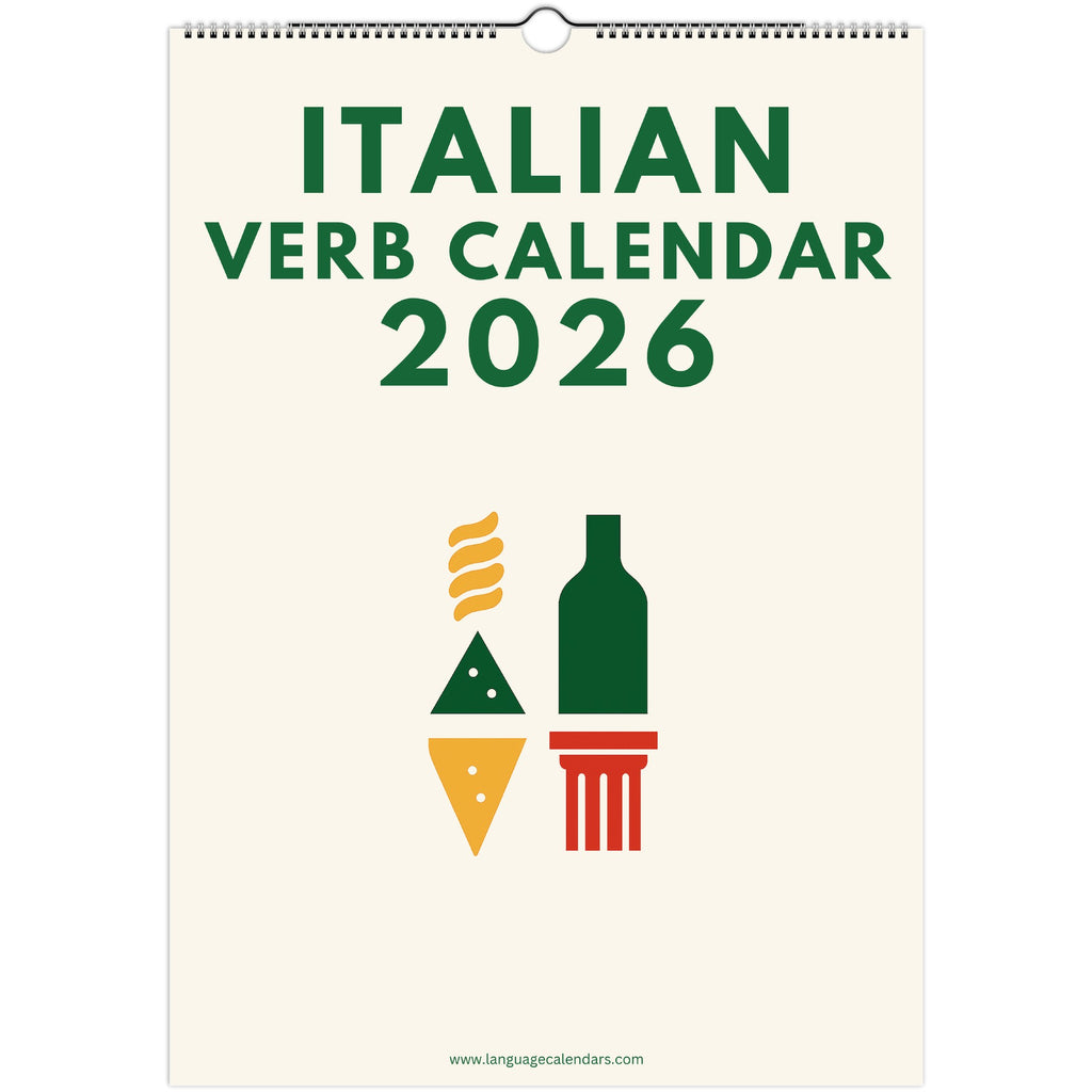 This beautifully designed A3 wall calendar features the 100 most commonly used Italian verbs, each with their full present tense conjugations, English translations, and the past participle together with the correct auxiliary verb (avere or essere). Whether it’s avere mangiato, essere andato, or essere stato, you’ll learn not only how to conjugate verbs but also how to use them naturally in conversation and writing.