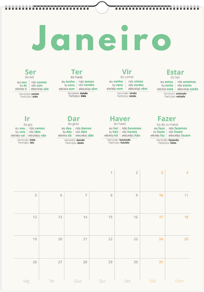 This elegant A3 wall calendar features the 100 most commonly used Portuguese verbs, each with their full present tense conjugations, English translations, and both the gerund and past participle forms. Designed for learners at all levels, it helps you understand how verbs work in context while keeping your language learning visible every day of the year.