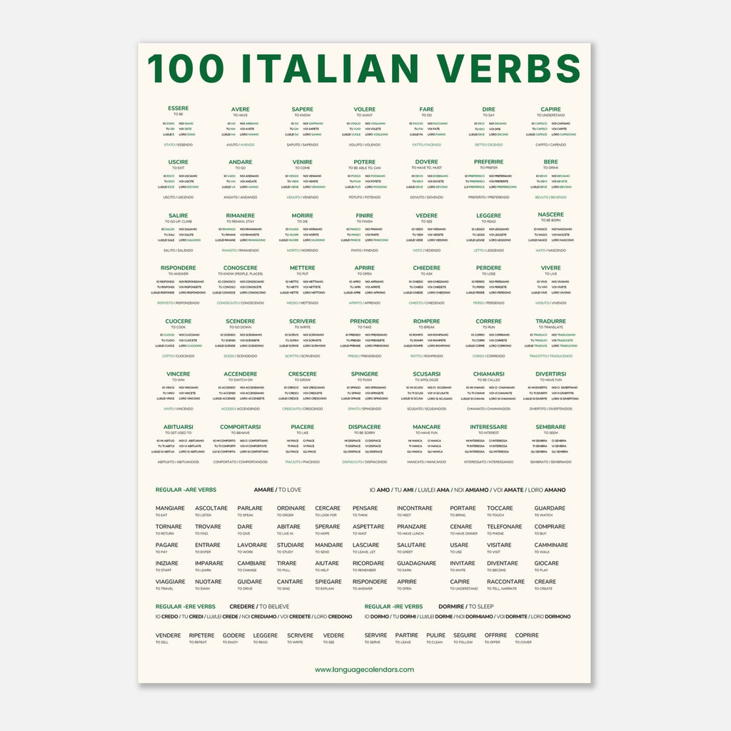 This minimalist A2 poster showcases 100 of the most commonly used Italian verbs, each with its present-tense conjugations clearly displayed. It includes both regular verb patterns and the most important irregular verbs, giving you a clear, visual foundation for mastering the language — from parlare and avere to essere and andare.
