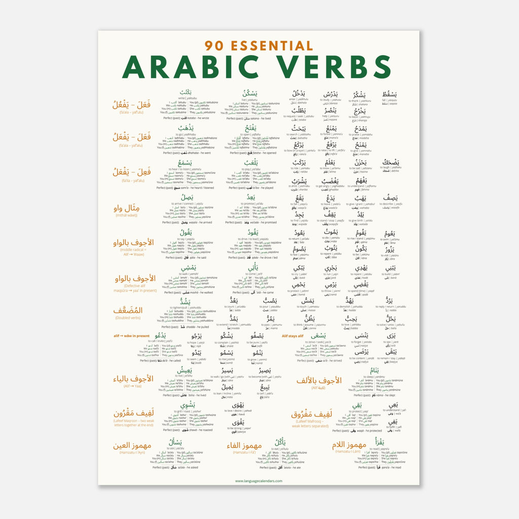 This minimalist A2 poster features 90 of the most essential Arabic verbs, each shown with imperfect (present) conjugations and the third-person perfect (past) form in brackets. Every verb includes tashkīl (vowel markings) and pronunciation guides to help you read and pronounce each form with confidence.