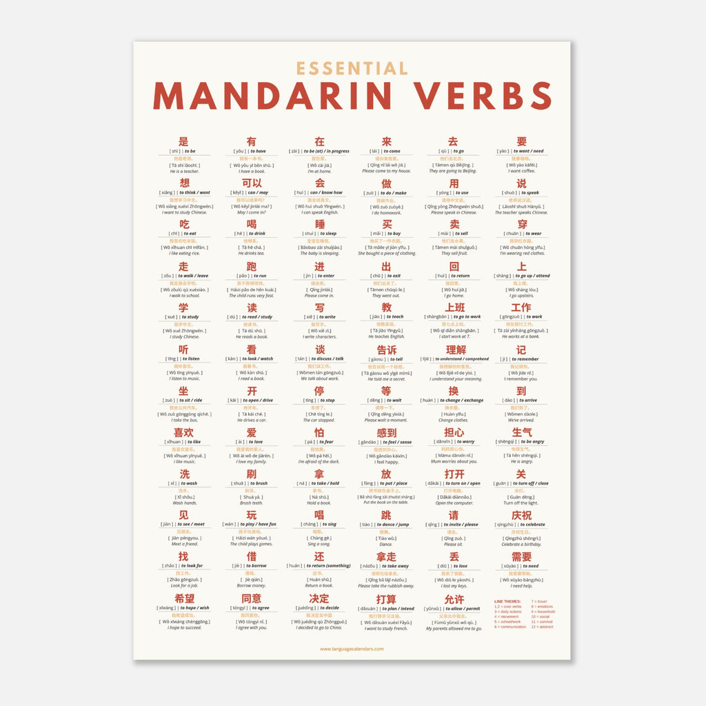 This minimalist A2 poster features over 70 of the most essential Mandarin Chinese verbs, each shown with the Chinese character, pinyin pronunciation, and a natural example sentence. Every line is grouped by theme — such as transport, daily life, emotions, work, and communication — to make learning intuitive and memorable.