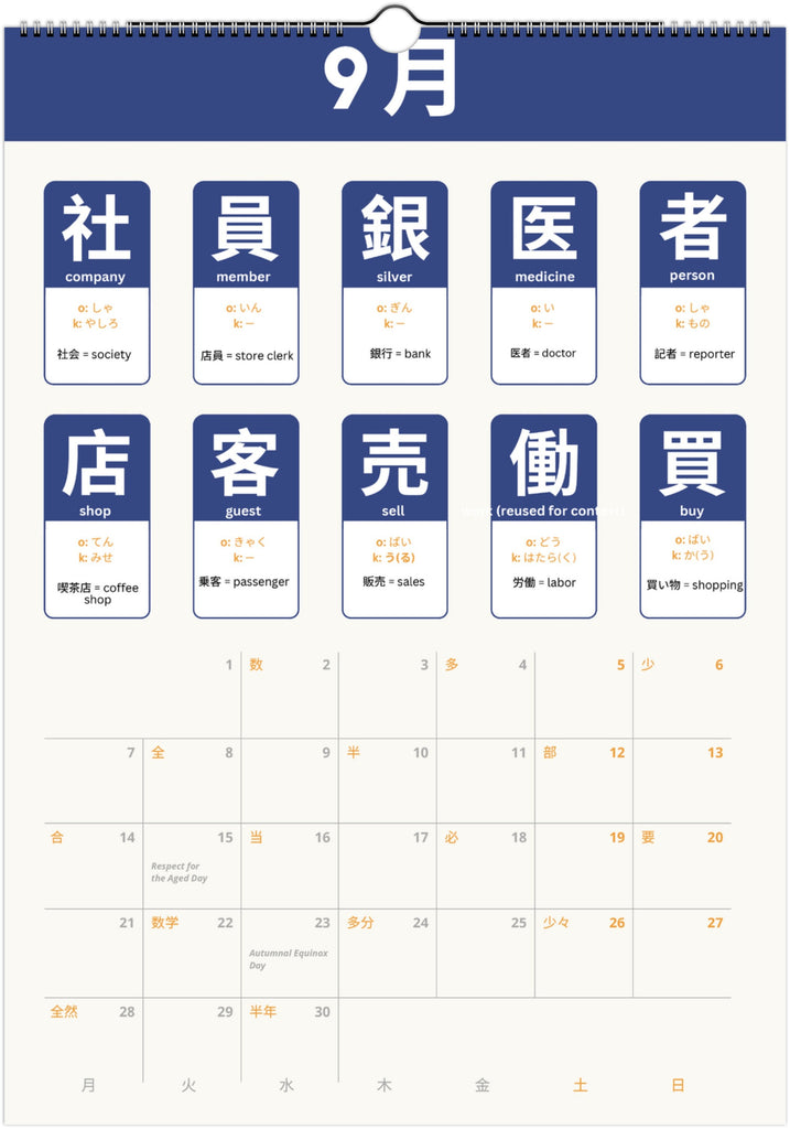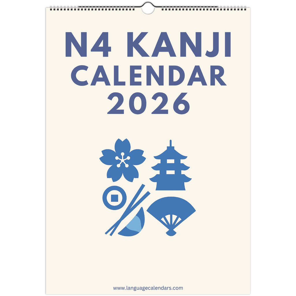 This elegant A3 wall calendar features 120 essential Kanji characters from the JLPT N4 level, each with English translations, both on’yomi and kun’yomi readings, and compound word examples showing how each Kanji is used in context.