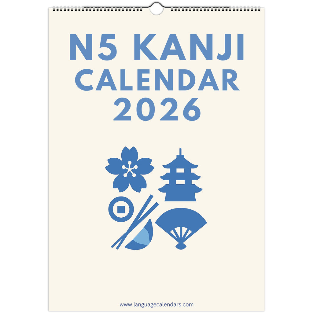 This beautifully designed A3 wall calendar features 120 essential Kanji characters from the JLPT N5 level, each with English translations, both on’yomi and kun’yomi readings, and compound word examples showing how each Kanji is used in context.
