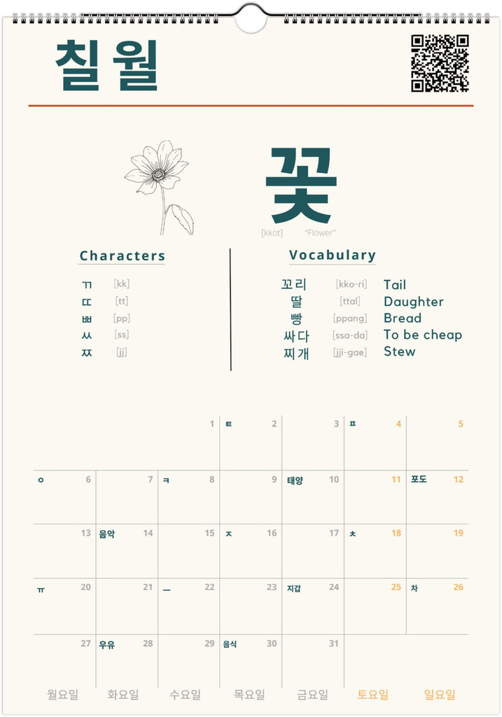 Each month introduces four new Hangul characters and five new Korean words, complete with English translations and a QR code so you can hear the correct pronunciation.